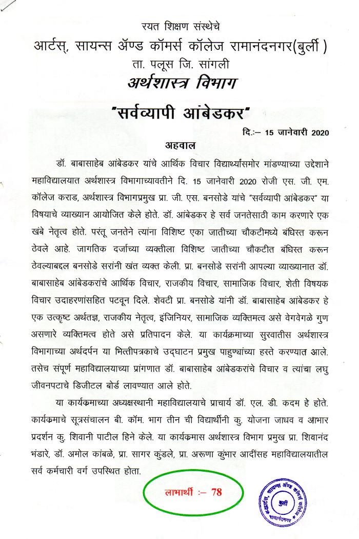 | 9 | Celebration of Death Anniversary of Dr. B. R. Ambedkar (Sarvavyapi Ambedkar) | 15/01/2020 |