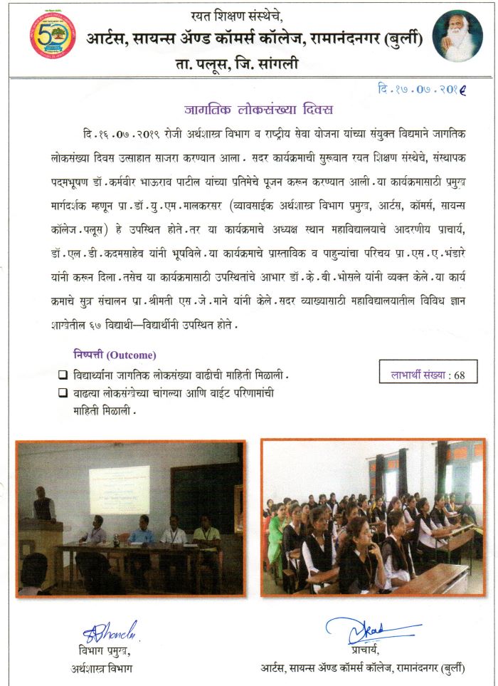 Dr. U. M. Malkar delivered lecture on the occasion of World Population Day |