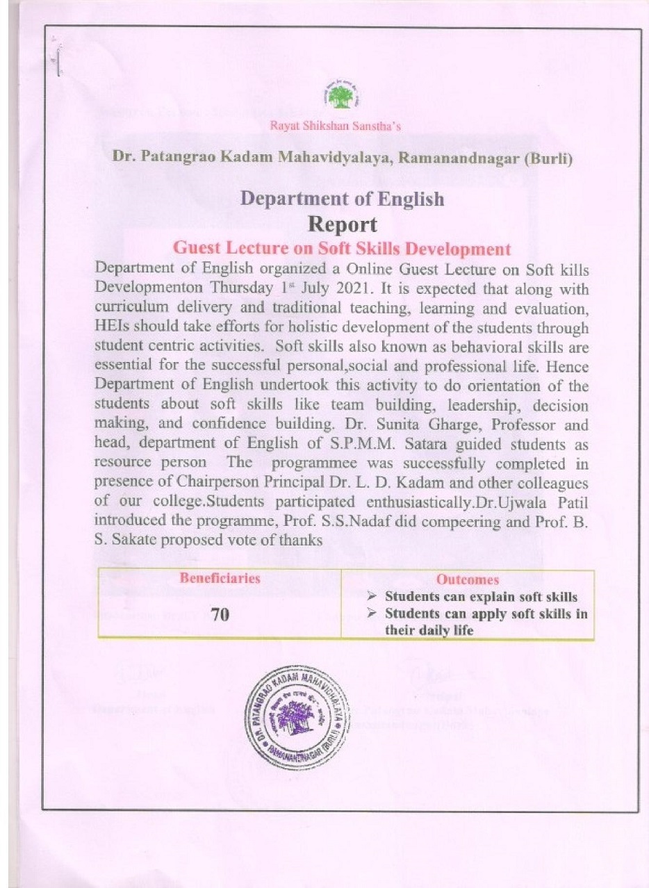 | 64 | 01/07/2021 | Guest Lecture on Soft Skills Development | View Report |