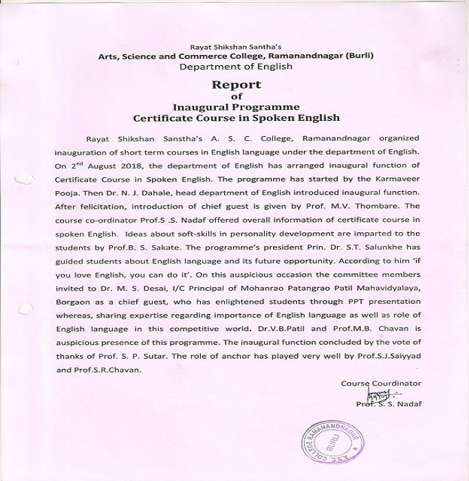 | 88 | 02/08/2018 | Inagural Programme Certificate Course in Spoken English | View Report |